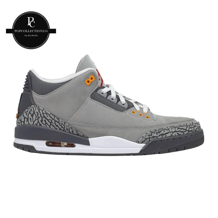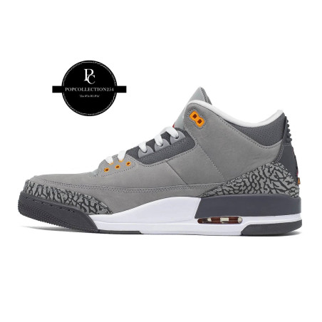 The Air Jordan 3 "Cool Grey" is a sleek and stylish take on a classic silhouette. It features a cool grey nubuck upper with signature elephant print overlays, and bold accents of orange and red on the eyelets and branding. The clean colorway makes it versatile for everyday wear while still standing out with subtle pops of color. Perfect for fans of retro Jordans who want something fresh, neutral, and timeless.